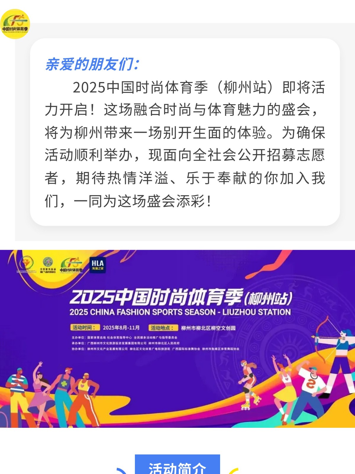 加入我們!2025 中國時尚體育季(柳州站) 志愿者招募中! 發(fā)布時間:2025年08月15日 10時來源:本站原創(chuàng)瀏覽:68 人次
